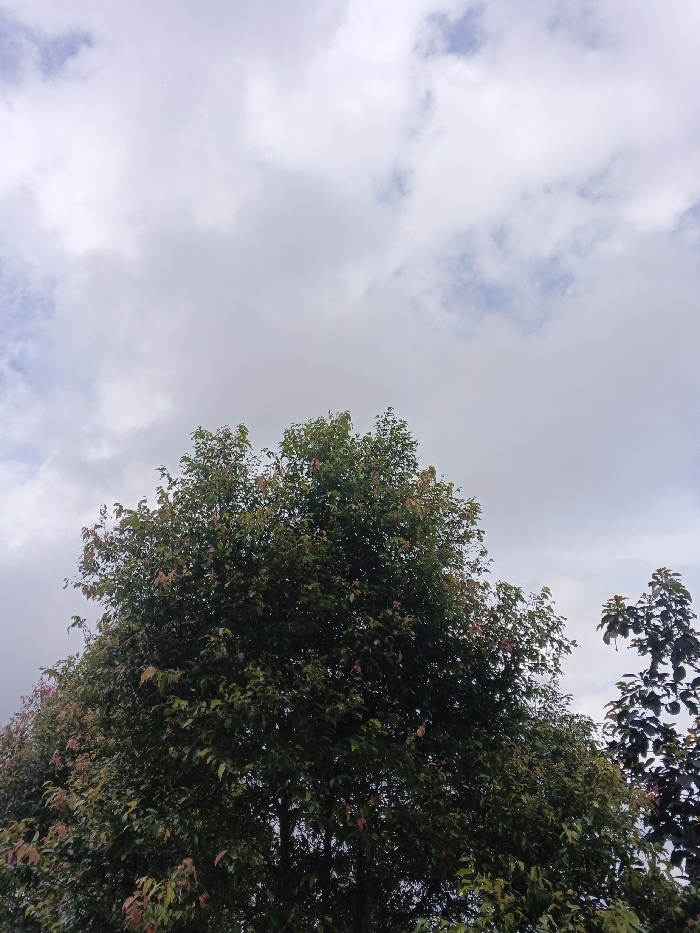 The image displays an outdoor scene in Pinnwe, Myanmar (Burma), primarily depicting the sky and tree canopies. The upper two-thirds of the frame consists of an overcast sky filled with varying shades of grey and white clouds, with small patches of lighter blue visible between cloud formations. The lower third of the image features the upper foliage of two trees. A large, dense tree canopy occupies the left and central areas, characterized by abundant green leaves with some reddish-pink new growth interspersed throughout. To the far right, a segment of a second tree canopy is visible, appearing darker and less dense. No people, distinct objects, actions, or interactions are present in the scene.