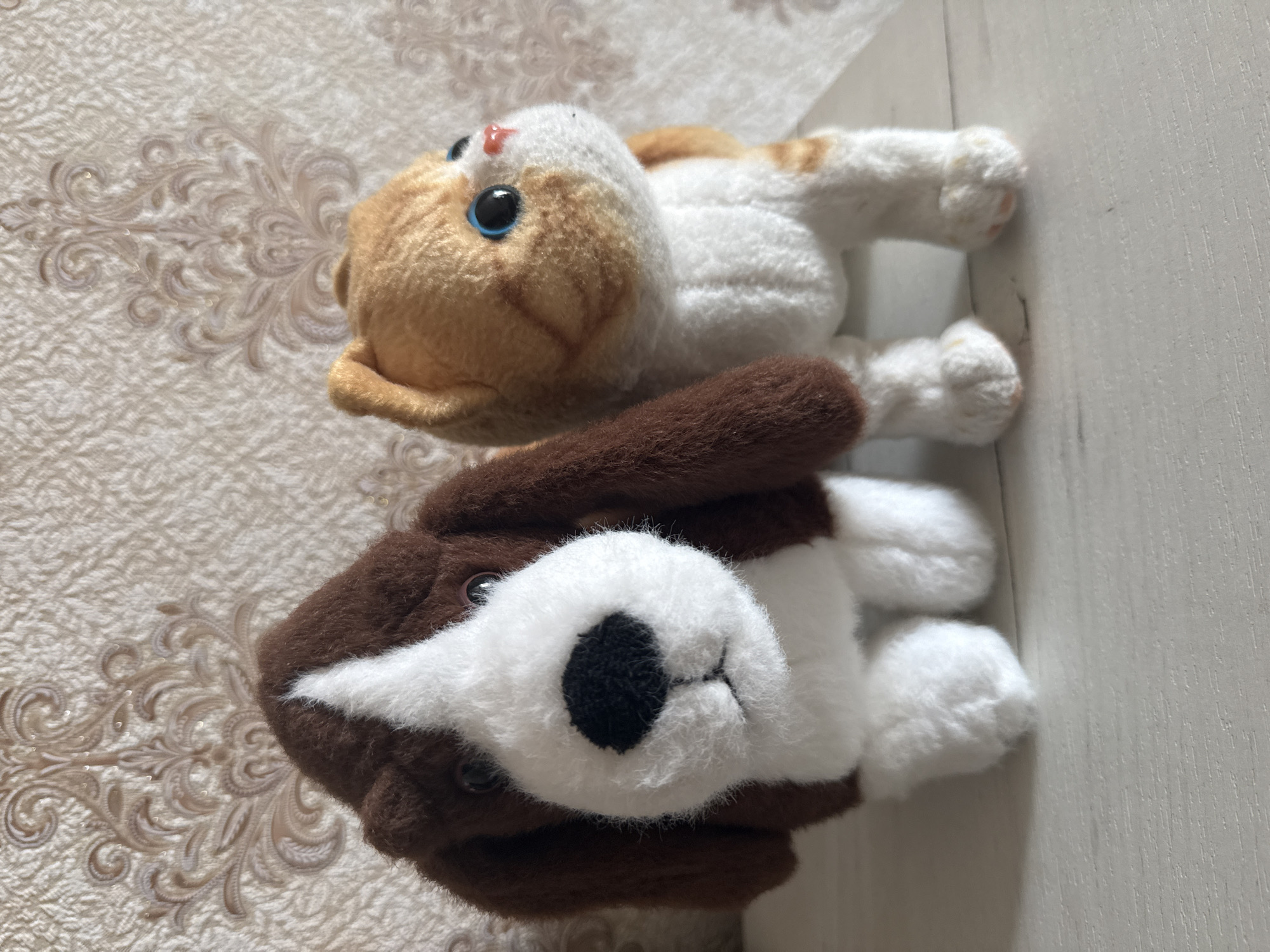 Two plush animal toys, a cat and a dog, are lying next to each other