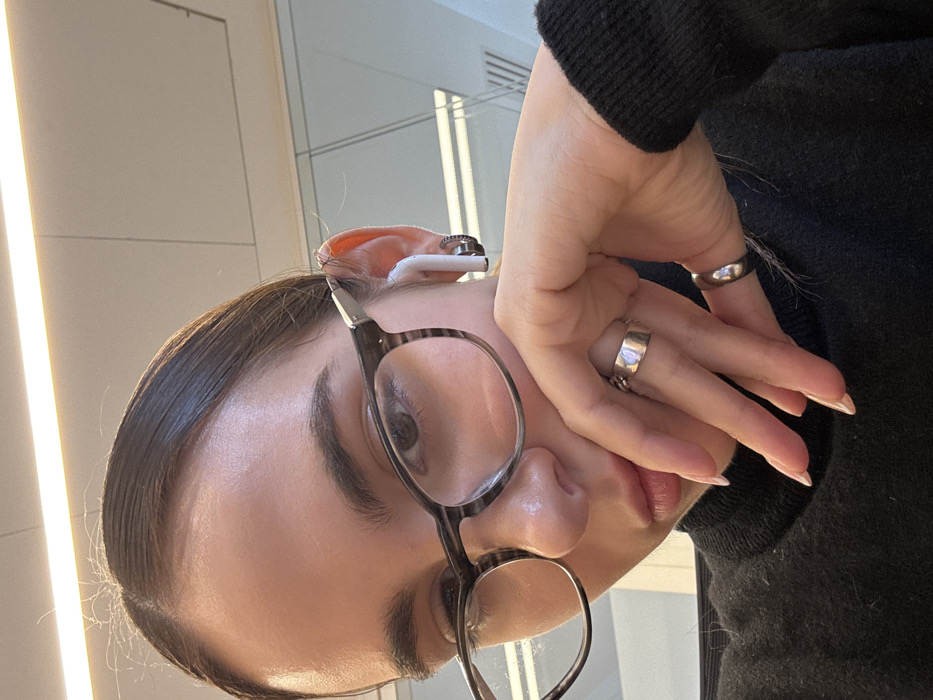 The scene captures a close-up, angled view of a female individual indoors in Paris, France. The subject, viewed from the upper torso, is positioned slightly off-center, gazing downwards and to the viewer's left. She possesses dark hair, pulled back, and wears spectacles featuring thick, grey-and-black striped frames. A white wireless earbud is inserted into her right ear, accompanied by a small dark stud earring. Her left hand is elevated, with fingers gently resting on her chin and lower lip. Two silver-toned rings adorn her left hand: a wide, textured band on the ring finger and a slender, plain band on the pinky finger. Her fingernails exhibit a light-colored polish. She is attired in a black turtleneck. The background reveals a modern indoor environment, characterized by an overhead linear light fixture and a glass partition or window reflecting ambient illumination.