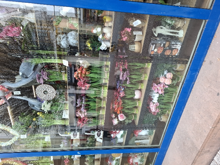 This image presents a retail shop window display in Plovdiv, Bulgaria, viewed from the exterior. The window comprises large glass panes framed by prominent blue-painted trim along the bottom and vertical edges. The glass surface shows reflections of the outdoor environment, including parts of a building and indistinct street elements. Inside, multiple dark-colored shelves are vertically stacked, exhibiting a dense arrangement of decorative items, primarily artificial flowers. The top display tier features two prominent, grey, stylized bird figurines resembling herons or cranes, positioned centrally amidst tall green artificial reeds and potted artificial flowers in purple and white. A circular, intricate black-and-white patterned decorative object is situated between the bird figurines, against a dark, brush-like background. The middle shelves display numerous rows of artificial flowers in clear vases or pots, often tied with twine. These include various shades of pink, red-orange, purple, and white blossoms. Other items on these shelves include a textured grey figurine (possibly an animal) and additional potted plants. The bottom shelves continue to showcase artificial flowers, with prominent pink and mixed-color arrangements. To the left, white decorative mushroom figurines with red caps are visible. To the right, a white male figurine in a relaxed, contemplative pose stands next to a small potted plant and a dark rectangular box containing multiple compartments or items. The foreground consists of a reddish-brown, rough-textured stone or concrete ledge directly beneath the window, transitioning to a lighter-colored, possibly pebbled, surface at the far left.