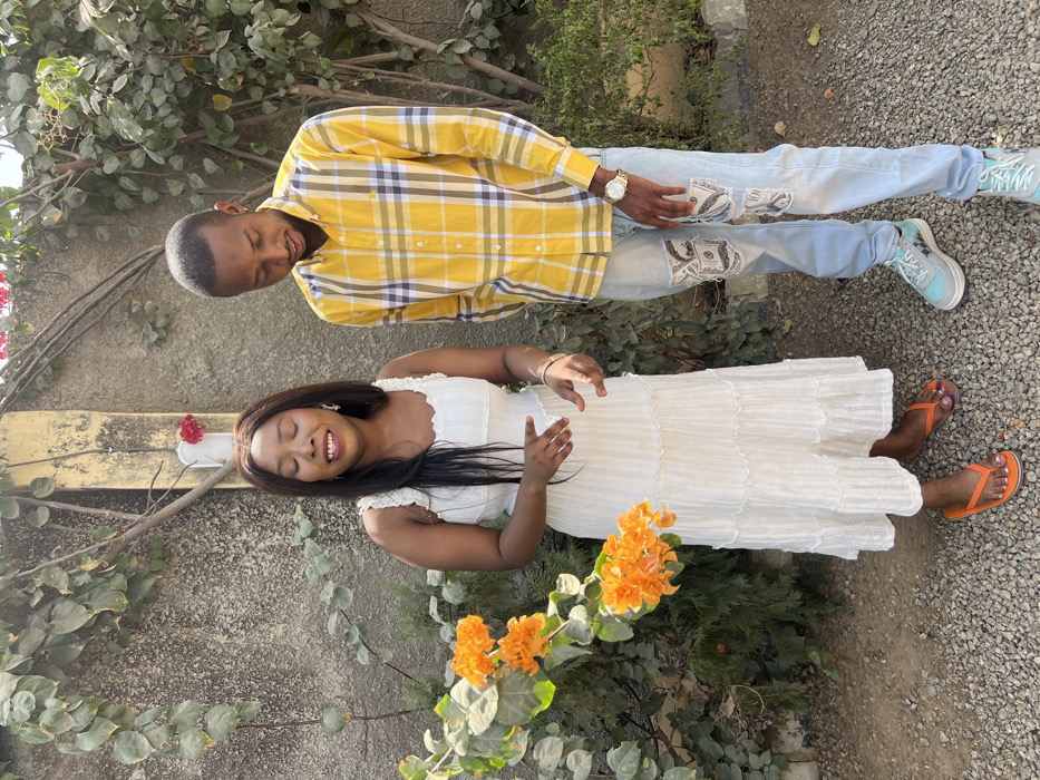 The image captures two individuals, a female and a male, standing outdoors in Giginyu, Nigeria. The female, positioned on the left, has long dark hair and wears a white, sleeveless, tiered maxi dress with orange flip-flops. Her eyes are closed, and she displays a smile. She wears earrings and a light-colored wristband on her right wrist. The male, standing to the right, wears a long-sleeved yellow, blue, and white plaid shirt, light blue ripped jeans with dollar bill patches, and light blue and grey sneakers. He is looking downwards, and a silver-toned watch is visible on his left wrist. In the immediate foreground on the left, a branch with vibrant orange bougainvillea flowers partially obscures the female. The background consists of a textured, light-colored concrete wall covered with green vines and foliage. A small red flower or ornament is affixed to the wall behind the female's head. The ground is covered with dark gravel.