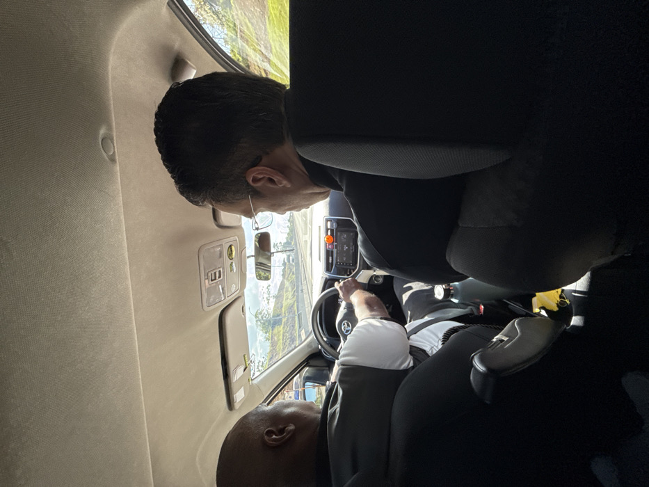 Inside a car, two individuals are visible