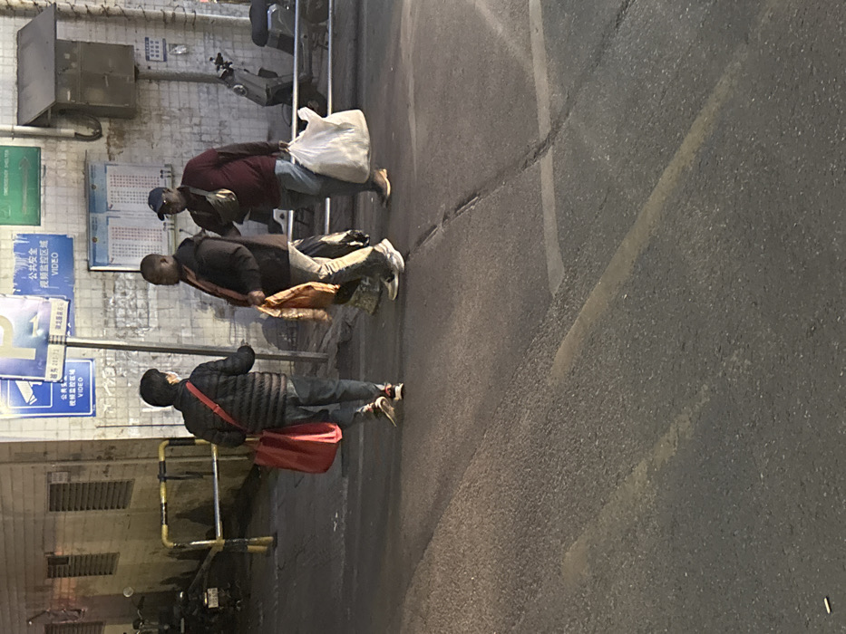 The image depicts an urban outdoor scene at night or dusk, within the Yuexiu District, China. Three adult males are present on an asphalt surface in front of a light-colored building wall. The leftmost individual, appearing East Asian, is viewed from the back-left. He wears a dark puffer jacket, dark jeans, and athletic shoes with white soles and red/black accents. A red tote bag with a red strap is carried over his left shoulder. He wears a light-colored face mask and has his right arm slightly extended forward. The middle individual, appearing Black, is seen in profile, facing left towards the leftmost person, suggesting an interaction. He wears a dark jacket, light-colored trousers, and athletic shoes with white soles. A crinkled, translucent brown/orange plastic bag is held in his left hand. The rightmost individual, also appearing Black, is seen from the front-right, in motion towards the right. He wears a dark red long-sleeved shirt, blue jeans, dark shoes, and a blue baseball cap. A light-colored fanny pack is worn across his chest. He carries a large, white, translucent plastic bag, filled with contents, in his left hand. The background consists of a light-colored building wall featuring ventilation grilles. Mounted on the wall are blue signs displaying Chinese text "公共安全" (Public Security) and "视频监控区域" (Video Surveillance Area) with a camera icon and "VIDEO." A green sign indicates "公共安全应急避难场所" (Public Security Emergency Shelter). A yellow and black metal barrier is visible to the left, and a silver scooter is parked behind a metal railing to the right. The asphalt ground exhibits cracks and faint markings.