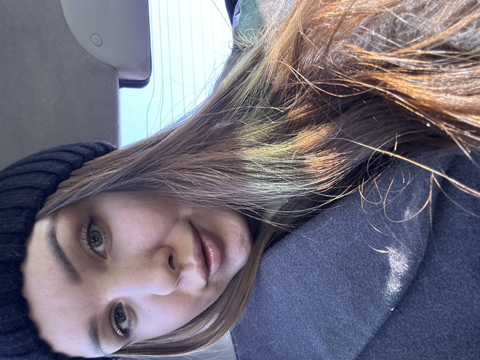 The scene is set within a vehicle in Chaikovsky, Russia. The primary subject is a female individual, appearing to be in her twenties or early thirties, occupying the majority of the frame from a close-up, slightly high-angle perspective. She wears a black ribbed knit beanie and a dark gray felt-like coat. Her long, light brown hair, featuring prominent auburn and blonde highlights, flows over her shoulders and chest, catching direct sunlight that illuminates it with a warm glow. Her face, characterized by light-colored eyes, dark eyebrows, and full, glossy lips, displays a slight, closed-mouth smile as she looks directly into the camera. The background consists of the vehicle's interior: a light-colored (beige/grey) headliner is visible at the top, beneath which a rear window reveals a clear, light blue sky traversed by faint horizontal defroster lines. Strong sunlight creates bright highlights on the subject's hair and the right side of her face, while casting softer shadows on the left side and her coat.