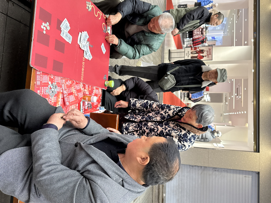 The image captures an outdoor scene in Beibei, China, specifically on a paved area or sidewalk immediately in front of a retail store entrance and a adjacent closed metal shutter. Six individuals, primarily elderly, are gathered around a low, rectangular table covered with a red mat, engaged in a card game. On the left side of the table, an elderly male with grey hair, wearing a dark green puffer jacket, is crouched, actively manipulating playing cards, stacks of paper currency (appearing as Chinese Yuan notes), and silver coins. The red mat displays a golden patterned border and dark rectangular outlines, with the date "2025年2月16日" prominently printed near the center. To the right of the table, a balding middle-aged male, wearing a grey suit jacket over a dark sweater and black trousers, is seated on a brown stool, observing the game. His hands are clasped. Adjacent to him on the table are numerous red slips with Chinese characters, a large pile of silver coins, an orange-capped pill bottle, and a small bright green plastic cup. Standing behind and around the table are four other individuals: 1. An elderly female with short grey hair, wearing a patterned black and white quilted jacket with a brown collar, leans forward, focusing intently on the game. 2. An elderly male with a grey cap, dark zippered jacket, and a grey shoulder bag, stands upright, observing the game from the center-left. 3. A person, largely obscured and wearing a dark puffer jacket, is kneeling or crouching behind the table, engaged with its contents. 4. In the background to the left, a male with a shaved head, wearing a dark jacket over a green top, stands slightly apart, looking towards the left. The background reveals the brightly lit interior of a clothing store through large glass panels, showcasing mannequins, clothing racks with winter apparel, and a red carpet. A promotional sign inside the store displays Chinese text and the date "2023年2月16日." To the immediate right of the store entrance, a corrugated metal roll-down security shutter is closed.