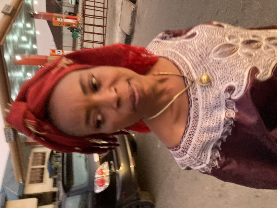 A person with red hair and a matching headscarf stands in front of a black car and a gas station. They wear a maroon top with white lace detailing at the neckline and a gold necklace. The person is facing the camera with a slight smile. The background includes gas pumps, a building with lights, and what appears to be a street or sidewalk.
