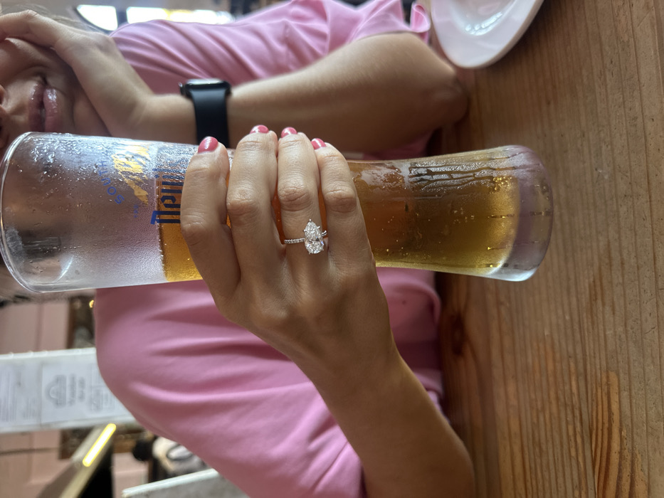 A medium close-up photograph depicts a person's upper torso, hands, and lower face seated at a light-colored wooden table. The subject's left hand, adorned with pink nail polish, grasps a condensation-covered, tall glass containing light amber beer. A prominent engagement ring, featuring a large pear-shaped diamond flanked by smaller diamonds on a pavé band, is worn on the fourth finger of this hand. A black smartwatch is visible on the subject's right wrist. The person is wearing a pink top, and their right hand rests against their lower face. A white ceramic plate is situated on the table to the right. The beer glass bears the text "SOUTH AFRICAN" and "NEWLANDS" along with a lion logo. The background shows a blurred interior, consistent with a casual bar or restaurant setting, featuring a vertical sign and indistinct figures. The "Newlands" inscription on the glass identifies the beverage source as Newlands Brewery, placing the location within the city of Cape Town, South Africa.