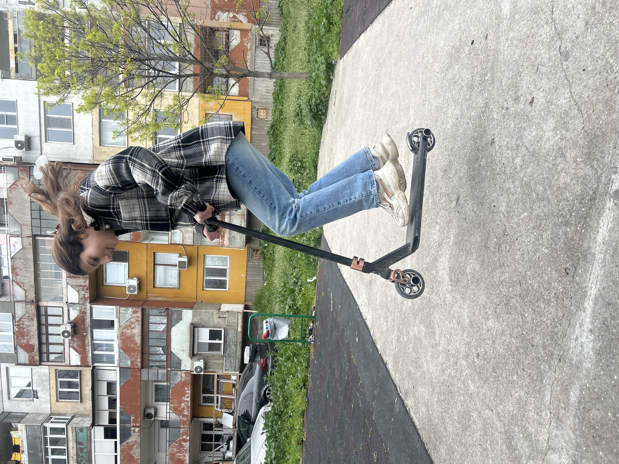 A young person is riding a black scooter on a paved surface. The individual is wearing jeans, light-colored sneakers, and a plaid jacket. In the background are apartment buildings, some with visible air conditioning units, and a small tree. A green metal structure, possibly a bike rack or support, is also visible near a parked car. The image appears to have been taken in an urban setting within Ruse, Bulgaria. The location is indicated by the architectural style of the buildings.
