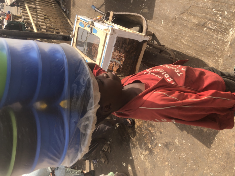 In Kufena, Nigeria, a young individual, likely a child, with dark skin, is depicted in profile, facing right. They balance a tall stack of new plastic bowls on their head, primarily blue with at least one green, all encased in clear plastic sheeting. The individual wears a red long-sleeved shirt with white text, partially visible, and dark trousers. They stand on an uneven, light brown ground surface under direct sunlight, which casts shadows. To the immediate right of the individual, a makeshift wooden pushcart or wheelbarrow is visible, topped with a rectangular display box featuring a clear cover and containing reddish-brown food items. The background, largely out of focus, reveals portions of other individuals' legs and feet, including one wearing light brown sandals, alongside a wooden barrier and indications of a bustling outdoor market or street environment.