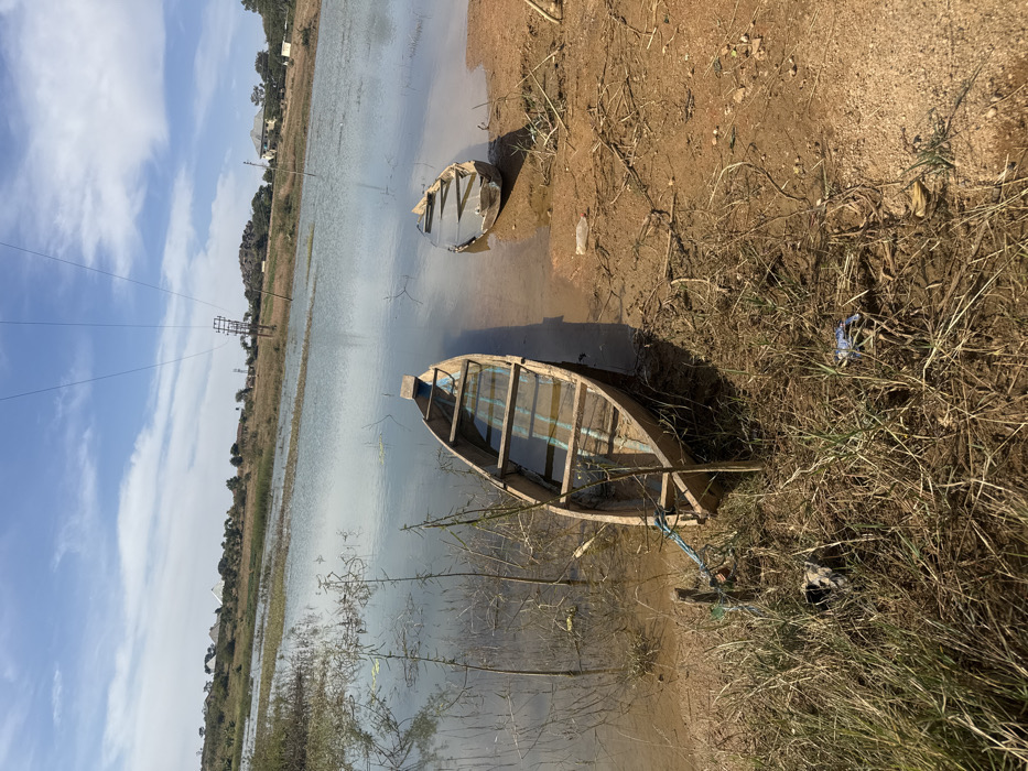 The image depicts a static outdoor scene of a natural or artificial water body, possibly a reservoir or lake, in Jos, Nigeria. In the foreground and mid-ground, two wooden dugout canoes are partially submerged along a muddy, reddish-brown shoreline. The larger canoe, positioned to the left, is light brown, waterlogged, and contains a shallow layer of water within its hull, revealing internal blue-painted planks. It is secured to a short wooden post on the bank with a blue rope. Adjacent to this boat, sparse, dry, light green and brown grass grows, interspersed with small, dead saplings. The second, smaller canoe is located to the right of the first, closer to the water's edge, appearing darker, more heavily submerged, and possibly damaged at its stern. The shoreline consists of dry, cracked reddish-brown earth with minimal vegetation and scattered debris, including a clear plastic bottle and other indistinguishable litter. The water body itself is calm and reflects the sky, appearing light blue-green. Submerged dead vegetation or branches are visible in the shallower areas. In the mid-ground, a series of three electrical power lines stretch horizontally across the frame, supported by at least two wooden utility poles that extend into the water. The distant background reveals a landscape of undulating terrain with sparse dry vegetation and scattered trees. Several buildings, including a multi-story structure with a light-colored facade, are visible on a distant rise to the right. Rocky outcrops are also present in the background. The sky is clear blue with scattered white clouds, indicating daytime conditions. No individuals are present, and no activities or interactions are depicted.