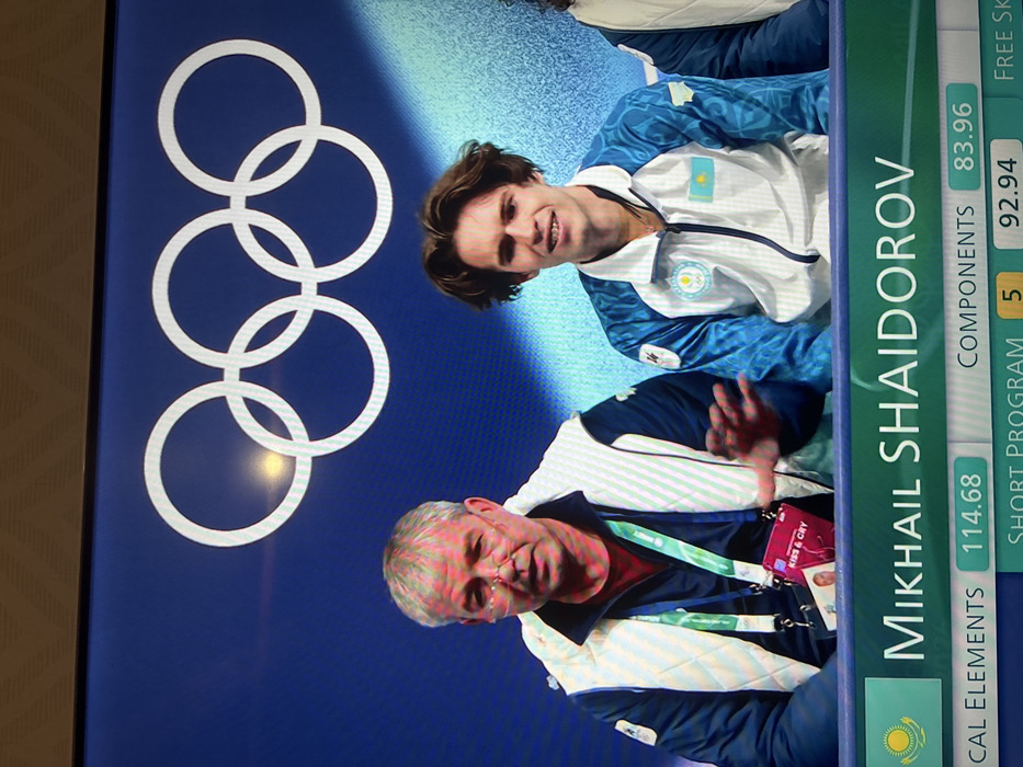 A television screen displays information about skater Mikhail Shaidorov during the Olympics. He's pictured with a coach. The screen shows the Olympic rings logo on a blue background. The skater's jacket displays the flag of Kazakhstan. Text includes "MIKHAIL SHAIDOROV," "TECHNICAL ELEMENTS 114.68," "COMPONENTS 83.96," "SHORT PROGRAM 5 92.94," and "FREE SK." A coach is wearing a lanyard with "KISS & CRY" written on it.