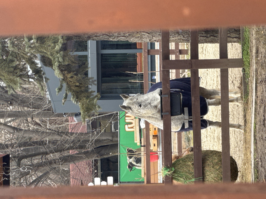 The image depicts an outdoor equestrian enclosure, specifically a paddock, located within Borisova Gradina in Sofia, Bulgaria, identifiable by the "RUUF TOP" signage visible on a green banner in the background. In the foreground, a blurry, reddish-brown vertical object partially frames the right side of the view. A brown wooden fence with horizontal rails spans the mid-ground, separating the viewer from the subjects. Within the enclosure, a dappled grey horse stands facing forward, positioned slightly right of center. The horse wears a dark blue blanket with light blue trim, secured by straps. A black, empty feed bucket is mounted on the fence directly in front of the horse's head. To the left of the dappled grey horse, a large, cylindrical hay net filled with green hay hangs from the fence, partially obscuring a second, light brown horse whose head and upper body are visible. The ground within the enclosure is bare earth. The background features a modern building with grey cladding and extensive glass windows, identifiable as the Ruuf Top Restaurant & Bar, situated behind the dappled grey horse. A green banner with white lettering, partially reading "RUUF TOP," is visible beneath this building. To the left of the banner, the head of a dark-faced, light-colored animal, possibly a goat or sheep, is visible above a wooden structure. Numerous leafless deciduous trees, indicative of late autumn, winter, or early spring, dominate the left and center background, while a single evergreen tree with dark green needles stands on the right, partially obscuring the grey building. No people are present. The animals are stationary.