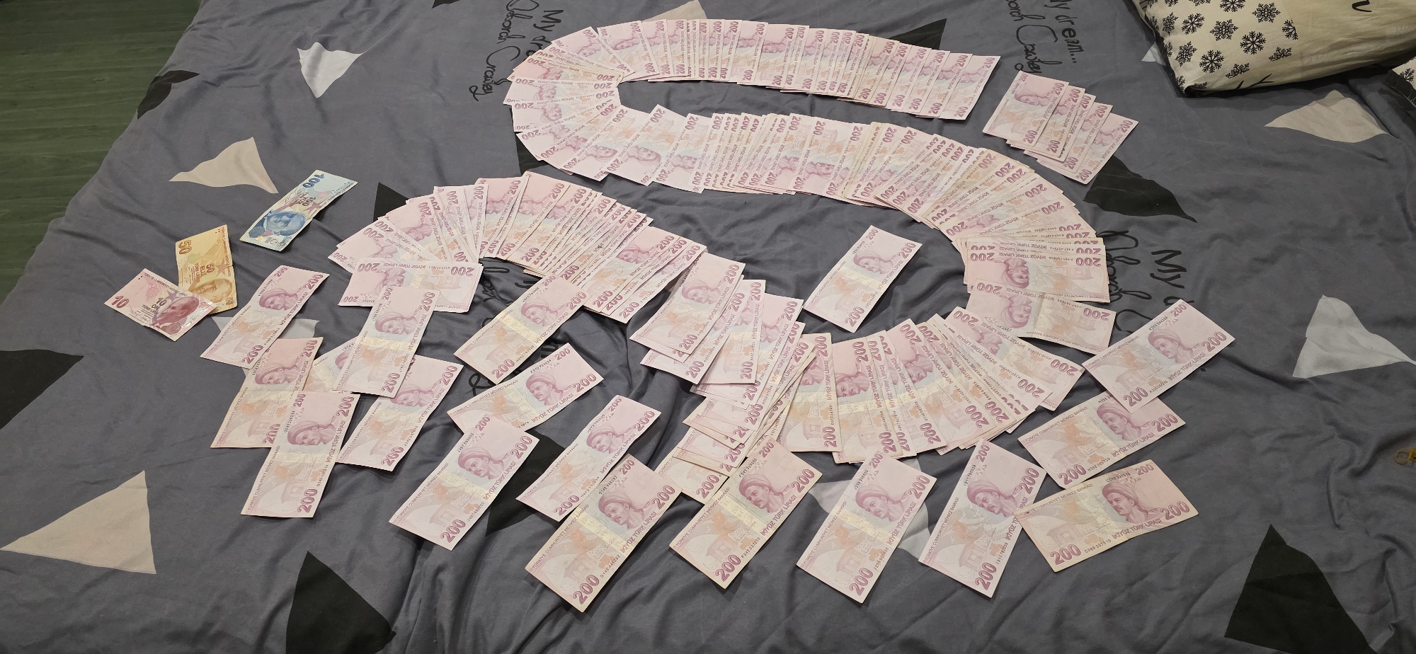 large amount of Turkish Lira banknotes spread out on a bed with a gray and white patterned duvet cover