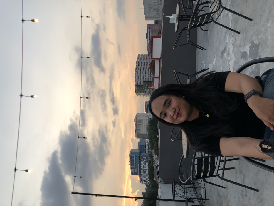 A young adult female is seated outdoors on a rooftop terrace in Semarang, Indonesia, captured at dusk