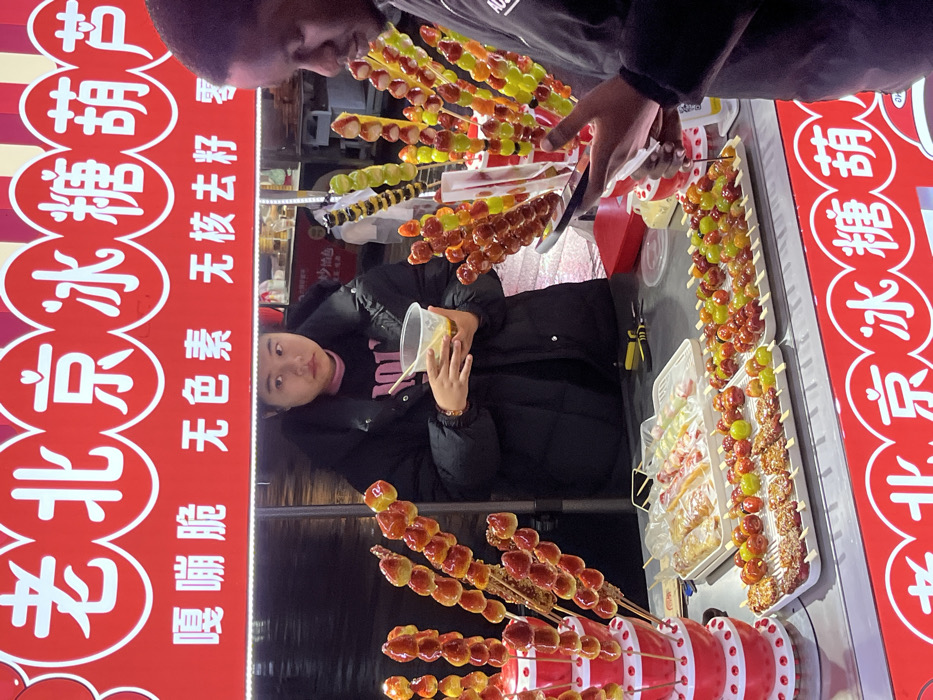 The scene depicts a brightly illuminated street food stall at night in Shuangfu, China. A female vendor of East Asian descent, wearing a black puffer jacket and a pink long-sleeved shirt, stands behind a metal counter, holding a clear plastic cup with a dark liquid and a white spoon. To her right, a male customer with dark skin, dressed in a dark jacket, is partially visible from the chest up, engrossed in a black smartphone held in both hands. The stall features a red overhead sign with white Chinese characters reading "老北京冰糖葫芦" (Old Beijing Candied Fruit) and smaller text indicating "嘎嘣脆 无色素 无核去籽" (Crispy, No artificial colors, Seedless/Pitted), illuminated by a white LED strip. The counter displays numerous tanghulu (candied fruit skewers), primarily featuring strawberries, grapes, and small red fruits coated in a clear sugar glaze. These skewers are arranged vertically in red and white tiered holders and horizontally on white rectangular trays. Additional packaged items are visible in clear plastic. A pair of yellow-handled pliers and a red box are present on the counter. The background is dark and out of focus.