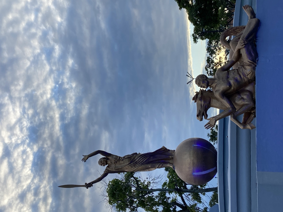 Two bronze-colored statues stand prominently against a cloudy sky. One depicts a winged figure riding a horse, with the horse appearing startled. The second statue features a woman standing atop a sphere, holding a spear or sword. Trees are visible in the background and partially obscure the statues. The statues appear to be part of a larger monument or structure.