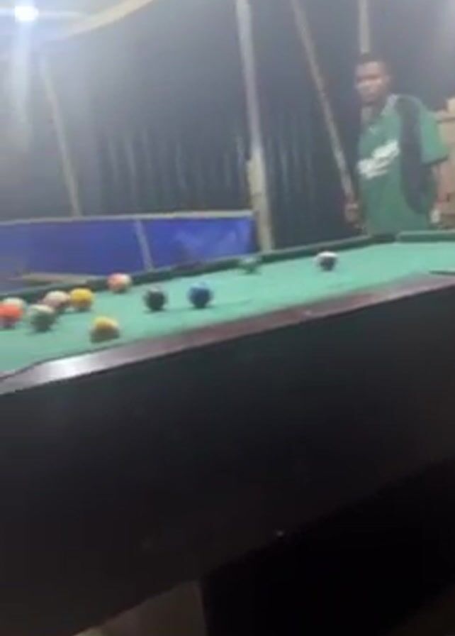 group of people gathered in an outdoor, covered space playing pool. One man is seen holding a pool cue, while others are seated and watching. The pool table is green with several balls on it. The area is lit with overhead lights, and the flooring appears to be tiled. People are wearing casual clothes.