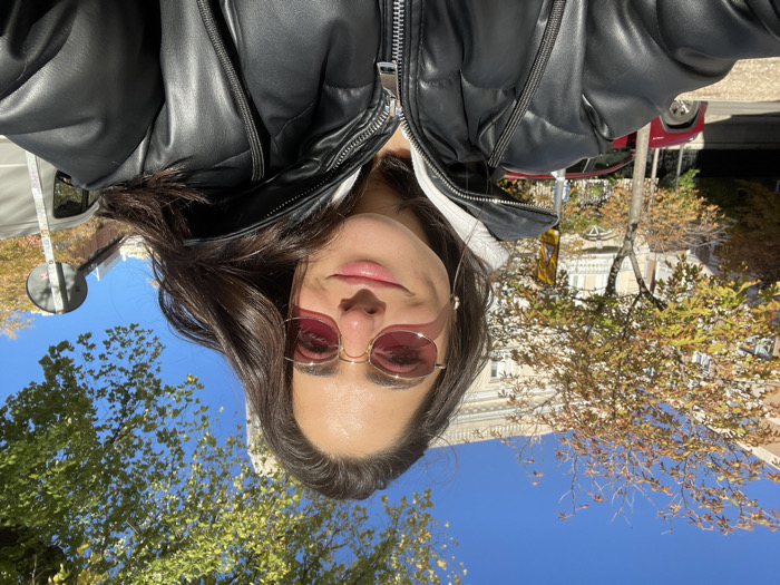 A young adult female is centered in a close-up, chest-up selfie, smiling slightly