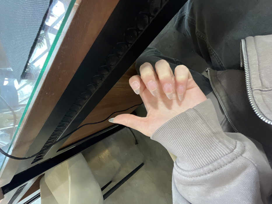 A person's hand, adorned with long, clear artificial nails, rests on a dark desk beside a glass-topped table. The individual wears a light brown hoodie. The desk has an ornately patterned, black underside. Gray jeans are visible in the background. A white chair is also present near the bottom left corner of the frame.
