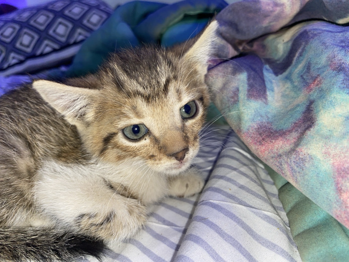 A young tabby kitten with light brown, dark brown, and white fur is depicted in a close-up, indoor setting