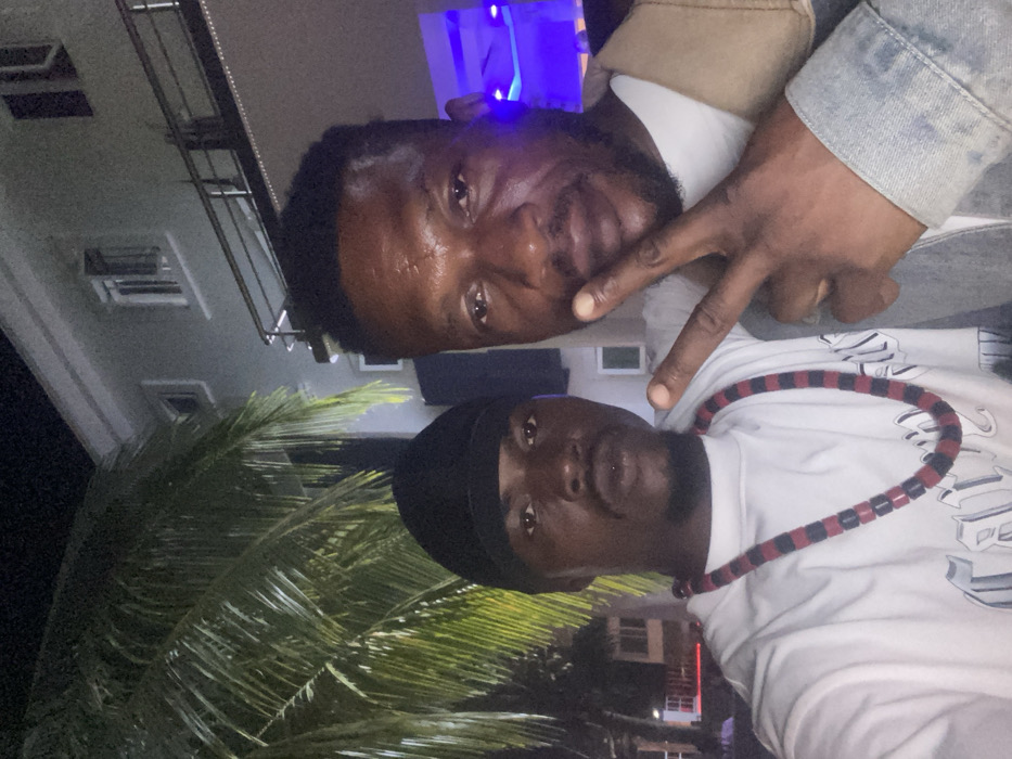 Two dark-skinned men pose for a selfie in front of a building and a palm tree at night. The top man wears a white shirt and a light-wash denim jacket and makes a peace sign with his hand. The bottom man wears a black durag, a white shirt, and a striped red and black necklace. The building behind them appears to be multi-storied, with lights illuminating some of the windows and blue lighting on the roof.