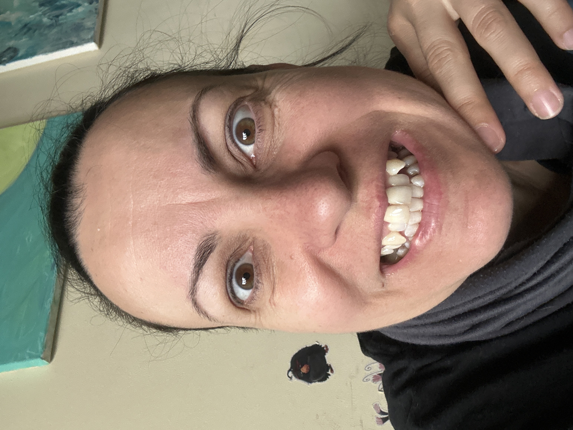 A close-up, rotated portrait shows a woman smiling. The woman has dark hair pulled back and brown eyes. Her teeth are visible in a wide smile. She is wearing a dark gray top. Part of a painting is visible on the left side of the frame. There is a dark splotch on the wall in the lower center of the image, near a pattern on the surface. The location and time of day is unavailable.