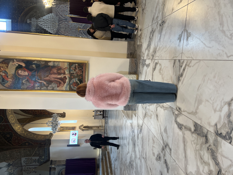 The image depicts the interior of a large church in Vagharshapat, Armenia, characterized by ornate architecture and religious artifacts. The foreground is dominated by a person, seen from behind, wearing a pink, fluffy, collared jacket and light-wash, wide-leg blue jeans, standing centrally on a polished white marble floor with grey veining. To the right of this person, a tall, gold-framed religious painting depicting a winged figure in red and blue robes is mounted on a white pillar. To the left of the central figure, a man in a black zip-up jacket and dark trousers stands facing right. Further left, a digital display screen shows three circular "no entry" style icons, and a set of steps with purple fabric draping leads to an elevated area. To the right of the central figure, a group of approximately 5-7 individuals, including men and women, are gathered, mostly facing away from the camera, clustered near what appears to be an altar or shrine with dark drapery in the background. Their attire is casual, including jeans and jackets. The church features high vaulted ceilings with intricate gold and dark decorative patterns. Large crystal chandeliers are suspended from the arches, with one prominently visible on the left side of the frame and another partially visible on the right. Natural light enters through tall arched windows.