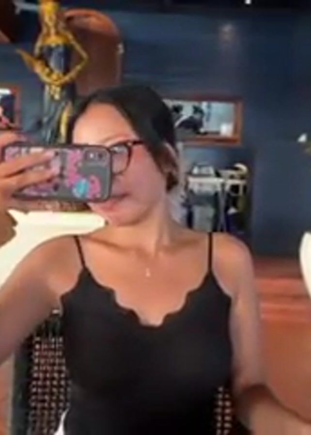 A young woman with dark hair is seated at a table in what appears to be a restaurant. She is wearing a black tank top with lace detailing and glasses. She is holding a smartphone in front of her face, as if taking a selfie or recording a video. The phone case has a colorful design with floral elements. A drink with a straw is on the table in front of her. Behind her are various restaurant decorations, including a golden statue, plants in pots, and a blue cooler with an advertisement for "Melala Bay 100% Real Fruits" ice pops. A waiter is visible in the background. The interior of the restaurant features blue walls and a red tiled floor.