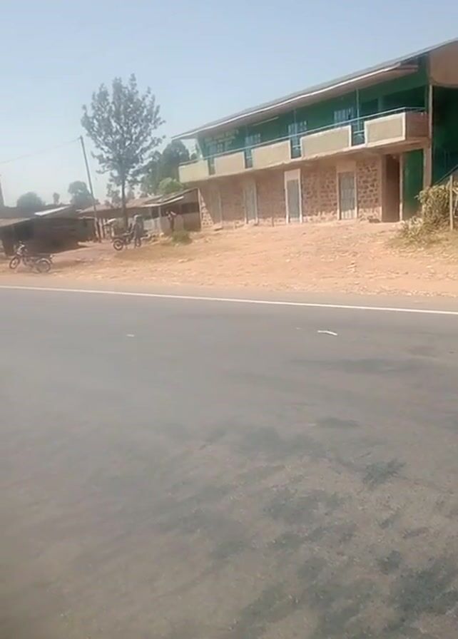 The scene is a road with a two-story building on the right side of the frame. The building has a light-colored brick or stone facade and a green roof with a second-story balcony. Several windows line the building's first floor. To the left of the main building, there's a smaller, more rustic structure with a darker roof. Several motorcycles are parked on the dirt area in front of the buildings. A tree is nearby. The road is gray and stretches across the foreground of the video. The sky is a light blue. The day appears bright and sunny. There are people visible but they are distant.