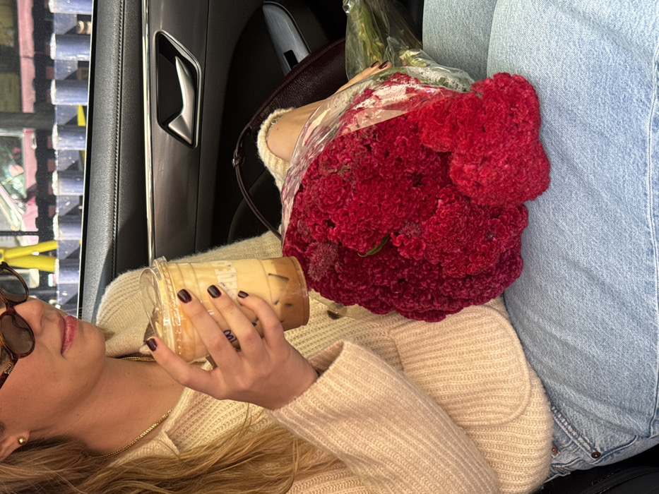 A female subject is seated in the passenger seat of a vehicle, partially visible from the mid-torso upward. She wears a beige ribbed cardigan, light blue denim jeans, and oval tortoise-shell sunglasses. Her blonde hair is pulled back, and a gold stud earring is present on her right ear. Her left hand, adorned with dark-painted nails and a small blue "MW" or "WM" tattoo on the ring finger, holds a clear plastic cup containing an iced coffee with layered cream and dark liquid. A substantial bouquet of deep red Cockscomb (Celosia cristata) flowers, encased in clear cellophane, rests on her lap. A dark brown handbag is partially visible beneath the flowers on her lap. The vehicle's interior shows a dark door panel with a chrome handle. The blurred background outside the window suggests an urban street or commercial area, featuring blue bollards, yellow structures, and green elements, consistent with the vicinity of a flower market like Mercado de Jamaica in Mexico City, Mexico.