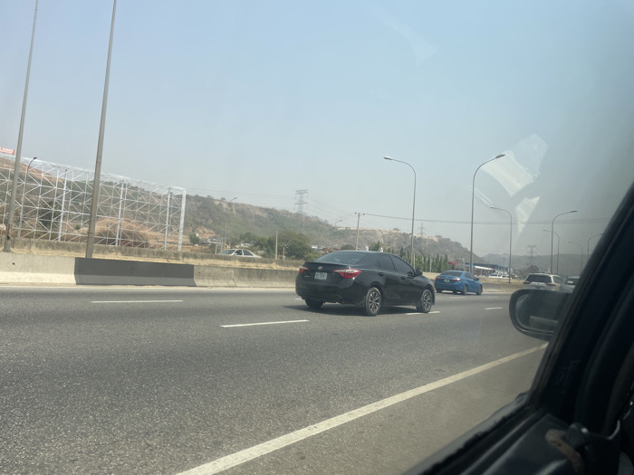 The scene depicts a multi-lane highway in Jiru, Nigeria, under a clear, bright sky. The vantage point is from inside a vehicle, with part of the dark vehicle's interior and a side mirror visible in the lower right foreground, showing reflections on the window. On the asphalt roadway, multiple vehicles are in motion. A black four-door sedan (Toyota Corolla) occupies the middle lane, moving away from the viewer. Further ahead in an adjacent lane, a blue sedan is visible. A white SUV is also present in the distance on the far right lane, and other indistinct vehicles are further down the road. The lanes are demarcated by solid and dashed white lines. A concrete barrier separates the highway from the shoulder on the left. Beyond the barrier, a large, white, lattice-like metallic structure, possibly a billboard framework, spans across the mid-ground. To the left of this structure, two tall, bare poles rise vertically. The background features dry, brown hills or mountains with sparse vegetation. Utility poles and power lines, including a large transmission tower, are visible on and above the hills. The overall environment suggests a highway through a semi-urban or arid mountainous region. No people are distinctly visible.