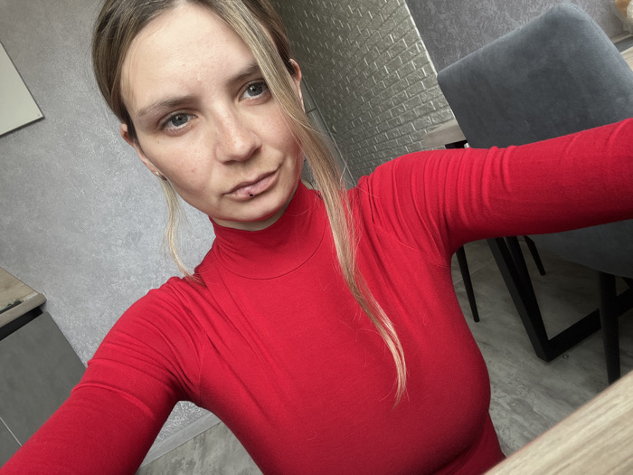 A female individual is depicted in a close-up, selfie-style photograph. She has fair skin, light-colored eyes, and light brown hair, with some strands framing her face. Visible freckles are present on her nose and upper cheeks. A small, dark stud piercing is located below her lower lip (labret piercing), and a small stud earring is visible in her left earlobe. She is wearing a form-fitting, long-sleeved, high-necked red garment. Her right arm extends towards the camera, suggesting she is holding the device. The background indicates an indoor environment. To the left, a light grey textured wall is visible, with a white rectangular object partially obscured in the upper left. A light-colored wooden or laminate surface is present in the bottom left. To the right, a darker grey wall with a distinct brick-like or tile-like pattern is visible. A dark grey upholstered chair with a black metal frame is positioned in the right background. A light-colored, patterned floor is discernible beneath the chair. No specific geographical markers or unique architectural features are present to determine a precise location within the city of Chaikovsky, Russia.