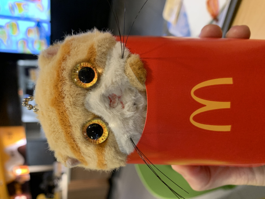 A human hand holds a red McDonald's french fry container in an indoor setting, likely a restaurant in Xihu District, China. A plush, orange and white tabby cat-like toy with large, spherical, golden-orange eyes and black whiskers protrudes from the top of the container. A small metallic keyring chain is visible on the toy's head. The background is blurred, showing soft ambient lighting, a light green object to the left, and a vibrant, illuminated display screen to the right, suggesting a fast-food menu board.