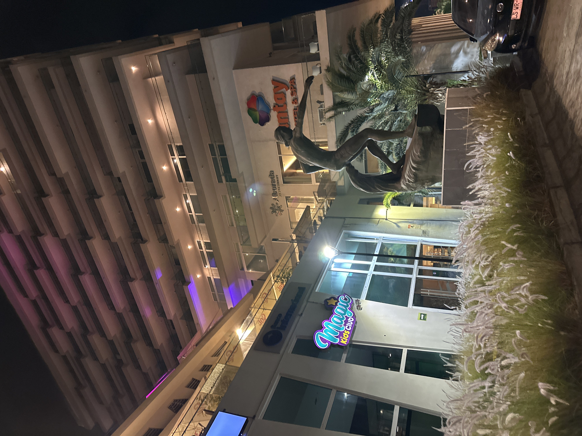 The image depicts a nighttime scene in Arica, Chile, featuring a modern building complex with a statue of two figures performing an acrobatic act. The building houses businesses including "Amay Hotel & SPA", "Borada Jet Restaurant," "Banco Falabella," and "Magic Kids Club." The statue is located at the entrance of the complex, positioned in front of some foliage. A black car is parked nearby. The building's architecture is characterized by staggered balconies and a pattern of lights.