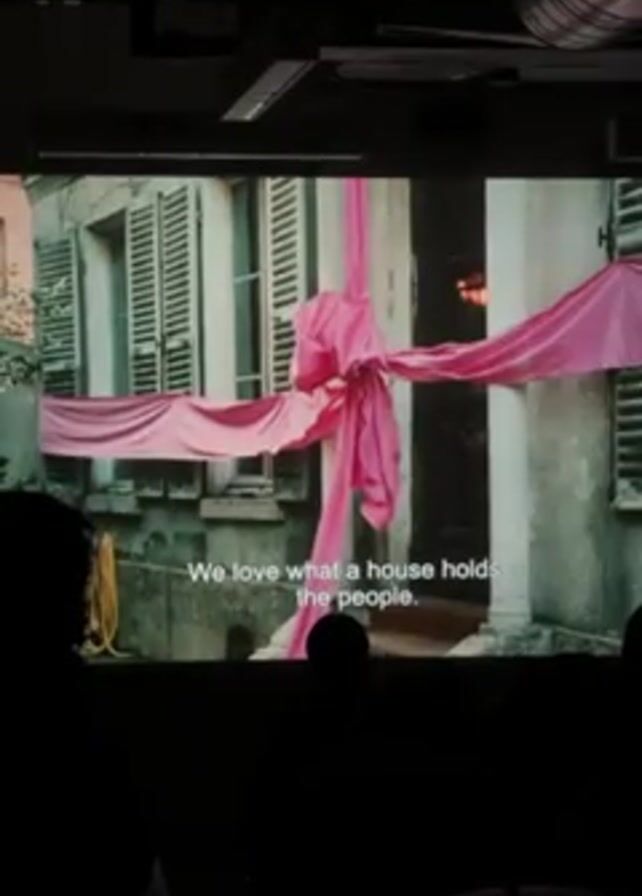 projection screen displaying a scene from a movie. The initial shot shows a building facade adorned with pink fabric. Subtitles on the screen read, "We love what a house holds… the people." The scene then transitions to a woman speaking, who is standing near a metal fence or gate. She has short brown hair and is wearing a floral top with a green scarf. Subtitles on the screen read, "A house is for living in with a man and children." The video is being watched by people, as can be seen by the silhouettes of their heads in the foreground. The environment appears to be a modern space with exposed pipes on the ceiling.