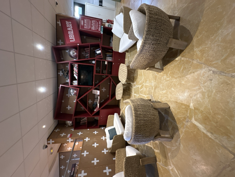 This image displays an interior view of a lounge or common area, identified as a "LIBRARY," located within an Adagio Access hotel in Serris, France. The floor is covered with large, irregularly shaped, light brown or tan stone tiles. The walls are brown, patterned with numerous repeating white plus signs. The ceiling is a white grid-panel drop ceiling, equipped with recessed lighting and a visible security camera in the upper left. The central feature is a large, dark red, asymmetrical shelving unit against the back wall, composed of various rectangular and angled compartments. This unit houses numerous books, decorative silver spherical objects, and a television screen displaying an image. A prominent red sign with "LIBRARY" in white capital letters is affixed to the top right of this unit. Below it, a white sign with red text provides information in French and English, including "HERE, WE LOVE - BORROW FOR FREE." The seating arrangement consists of several pieces of furniture made from light-colored woven wicker, including at least two two-seater settees and three armchairs, all fitted with white cushions and supported by light wooden legs. Two small, circular, slatted wooden tables are positioned centrally among the seating. A red fire extinguisher stands against a white cabinet in the background right. A metal railing is partially visible in the upper left, indicating a potential mezzanine or elevated section. No individuals are present in the scene.