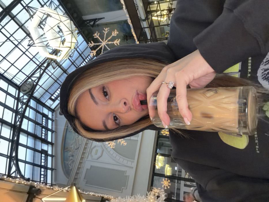 A young adult female with light skin and blonde-streaked brown hair is depicted indoors, wearing a dark hooded sweatshirt. She is seen from the chest up, holding a clear, textured glass containing an iced, light brown beverage with her right hand. Her lips are pursed around a dark straw, from which she is drinking. A ring with a prominent, clear, oval-shaped stone is visible on her right ring finger. Her fingernails have a French manicure. The background features a grand interior space with a high, arched glass-paned ceiling supported by dark metal framework. Classical architectural elements are visible, including an arched wall section with a light blue mural depicting figures. White snowflake-shaped light fixtures and strands of white fairy lights are suspended. A large, geometric light fixture hangs from the ceiling. The setting is identified as the interior of the Magna Plaza, located at Nieuwezijds Voorburgwal 182 in Amsterdam, Netherlands.