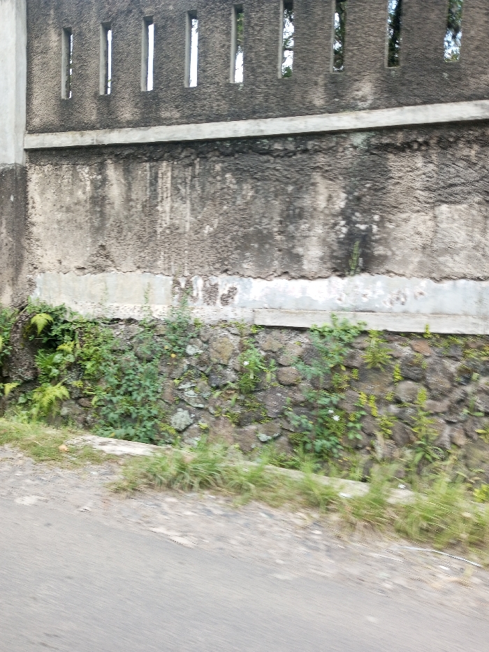 The scene in Cibodas, Indonesia, depicts an exterior wall structure alongside a paved road