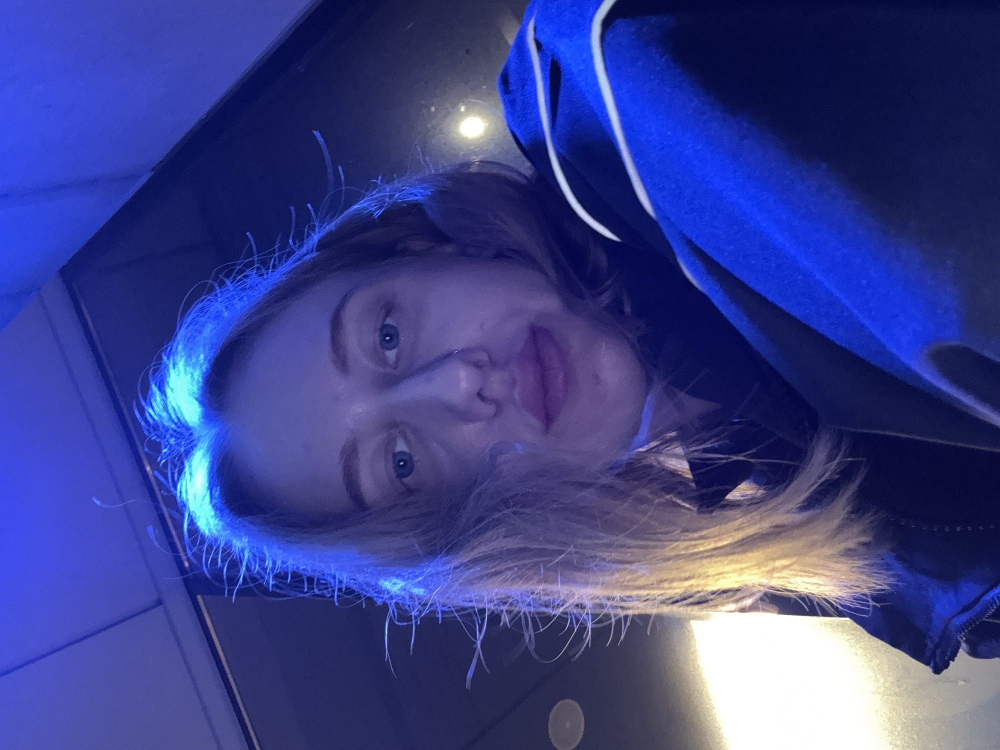 A photo of a fair-skinned woman with blonde hair taken from a low angle. The lighting is cool-toned, with a strong blue cast across her face and hair. She has blue eyes and her lips are slightly parted. She is wearing a dark blue jacket with a white stripe on the shoulder. The background appears to be an interior space with reflective surfaces. There is a light source in the background, possibly a ceiling light, which is creating a glare. The image is tilted. The city of Aksay, Russia, is not discernible from the visual information.