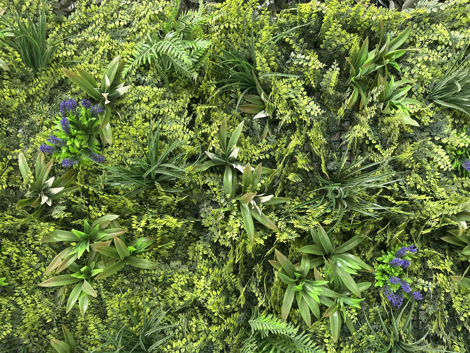 The image displays a vertical arrangement of dense, artificial foliage, commonly known as a green wall or vertical garden