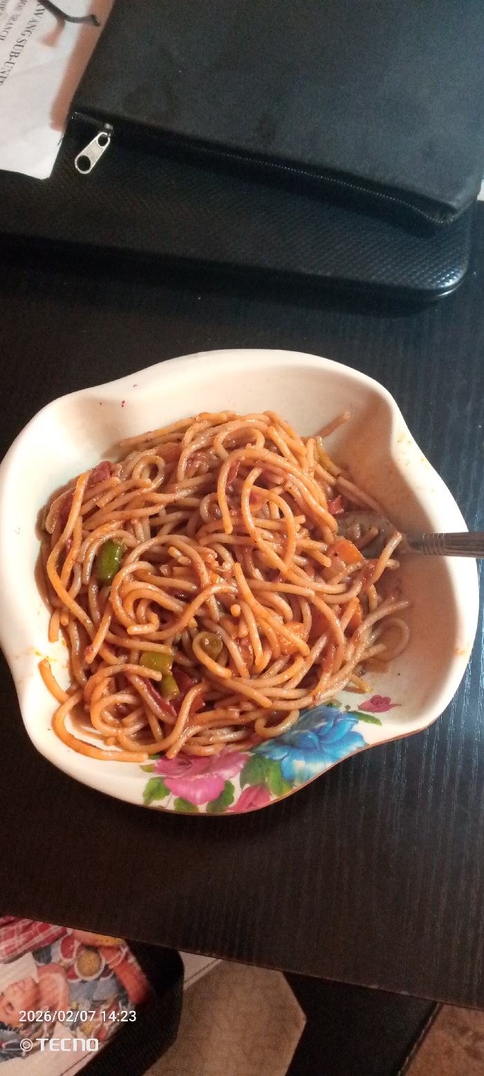 An overhead view captures a meal served on a dark, textured tabletop in an interior location, likely a home or office workspace in the city of Unknown, Unknown. The central subject is an irregularly shaped, cream-colored bowl containing spaghetti. The spaghetti is coated in a reddish-orange sauce and mixed with visible pieces of green bell pepper and other chopped vegetables. The bowl's inner rim displays a floral pattern featuring pink and blue blossoms with green leaves. A silver-colored fork is partially inserted into the spaghetti on the right side of the bowl. In the upper left background, a black zippered case or laptop bag is partially visible, with a silver zipper pull. A white document with black text, including phrases like "WANG SUB-UNIT" and "OS BRANCH," protrudes from behind or beneath this black object. In the lower left corner, a fragmented view of a multi-colored item, possibly a patterned fabric or book with cartoonish illustrations, is present. A digital timestamp "2026/02/07 14:23" and an "@ TECNO" watermark are superimposed on this area. No individuals are visible in the scene.