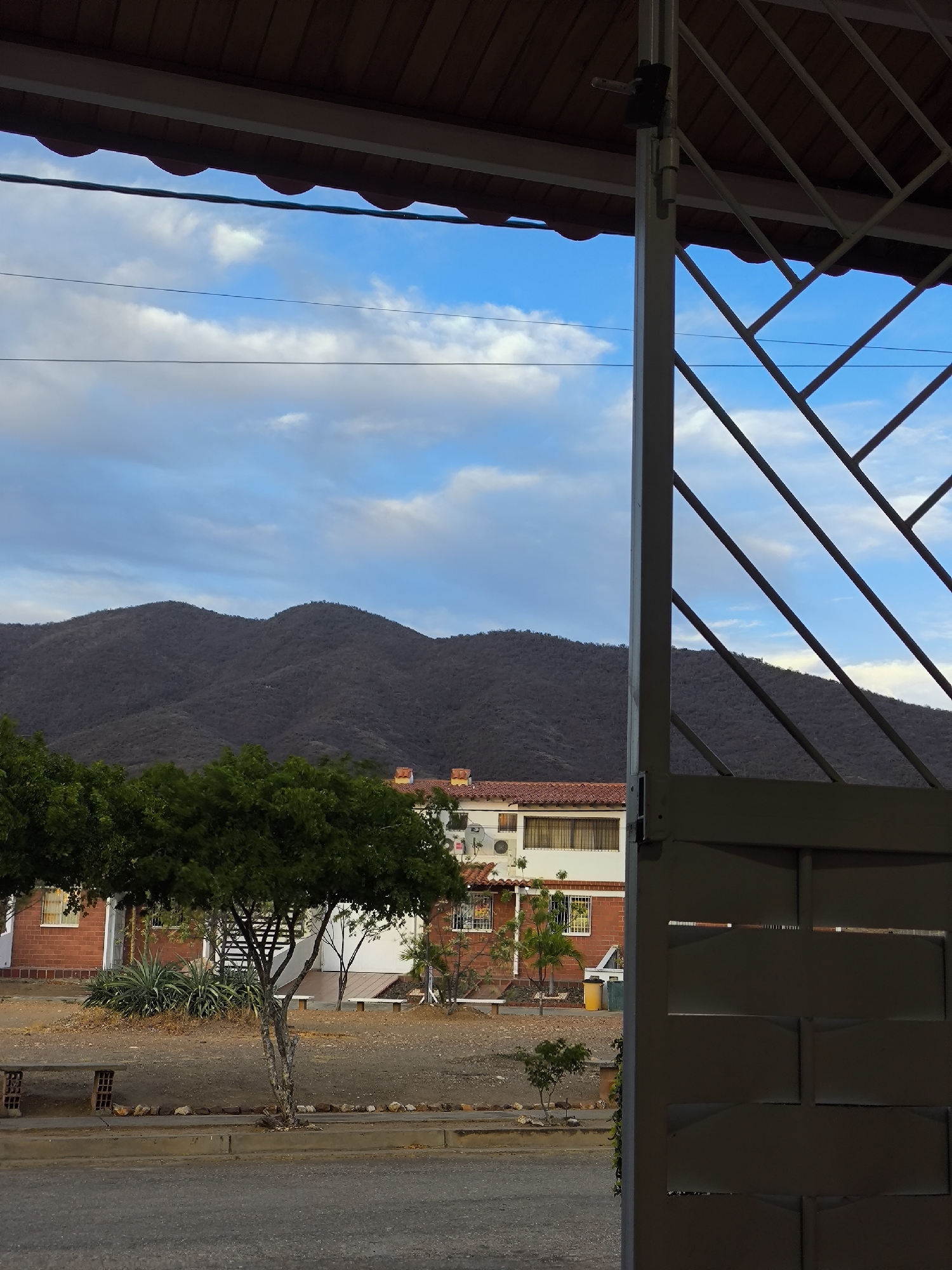 The image presents a view from within a structure, looking out onto a street in what is possibly the city of La Guardia, Venezuela. **Setting:** The scene is an exterior setting with a street, houses, trees, and a mountain range in the background. The gate or barrier in the foreground provides a framed perspective. **Objects:** * A partially open gate is present in the foreground, constructed with a decorative metal design. * A street stretches across the scene. * A row of houses with brick and white facades and red tiled roofs is visible on the opposite side of the street. * Trees and sparse vegetation line the roadside. * Mountains form the backdrop. * A blue sky with scattered clouds is above the mountains. * Concrete brick benches are also visible. * A yellow trash can can be seen as well. * Electrical wires are strung above the street. **Environment:** The environment appears semi-arid or dry, suggested by the vegetation and the color of the ground. The presence of mountains indicates a landscape. The lighting suggests it is daytime, with a cloudy sky that does not permit harsh shadows.