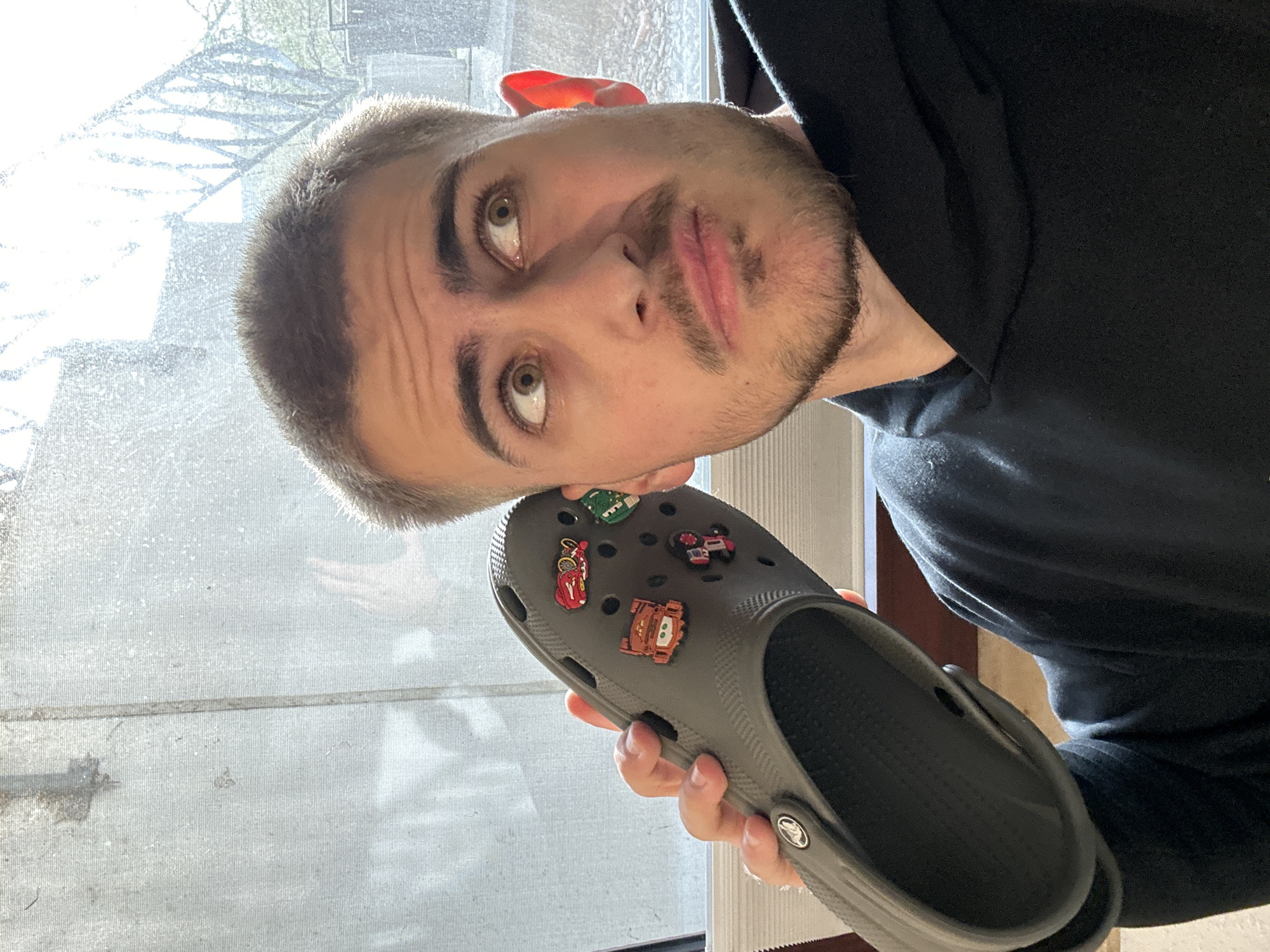 A male individual is depicted indoors in Essen, Germany. He is seen from the chest up, positioned in front of a window. The subject has short light brown hair, light-colored eyes, and stubble on his face. He is wearing a black hooded sweatshirt. His right hand holds a single grey Crocs Classic Clog shoe to his right ear, with the sole facing away from the camera. The shoe is adorned with five Jibbitz charms, including representations of Lightning McQueen, Mater, and Jackson Storm from Disney's Cars, along with a black and pink car charm and a partially visible green character charm. The subject's gaze is directed upwards and to his right, with a slightly furrowed brow and pursed lips, indicating a pensive or confused expression as he holds the shoe to his ear. Behind him, a window reveals an out-of-focus outdoor scene with bright daylight, showing blurry tree branches or structural elements. The windowpane appears textured or partially obscured.