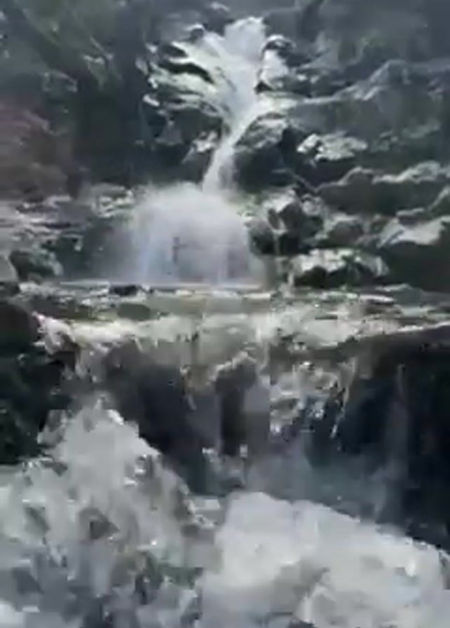 waterfall cascading down a rocky slope. The water is white and foamy as it tumbles over the rocks. The surrounding environment appears to be a forest, with trees visible on the edges of the frame. The light is bright, creating reflections on the water's surface. The camera angle is low, providing a ground-level perspective of the waterfall.