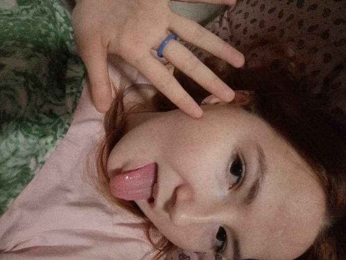 A person with red hair is lying on a bed with green and brown patterned linens. They are sticking their tongue out and holding their hand up, with a blue ring on their finger. The person's face is close to the camera and they appear to be looking directly at the viewer. The lighting is soft and natural.