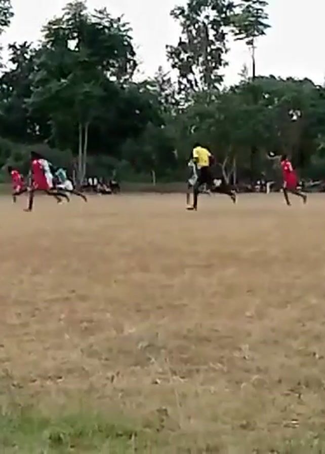 A wide shot shows a soccer game in progress on a mostly brown, grass-covered field. The players, some in red uniforms and others in green, are spread across the field, some jogging and some actively running towards the ball. The ball itself is in the air in the center of the field. On either side of the field, a white painted line marks the boundary of the playing area. In the background, a line of green trees forms a natural backdrop, with a few individuals visible watching the game from the sidelines. The sky is overcast, suggesting a cloudy day. There is some background chatter from spectators nearby.