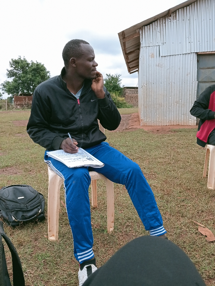 man, wearing a black jacket and blue pants, sitting on a white plastic chair, holding a pen and looking off to the side. He is seated in front of a corrugated metal building, which is located in Nangili, Kenya (coordinates: latitude: 0.745, longitude: 35.146). There is a black backpack on the ground to the left of the man. There is a small, white, wooden chair in the background, and a person wearing a red shirt seated in the chair, is partially obscured by the man's body. Grass and shrubs are in the background, and a light gray building is visible. The sky is overcast.
