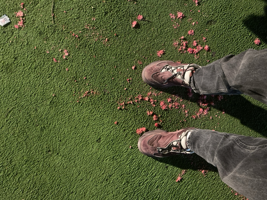 The scene depicts a high-angle, downward view of a person's lower extremities standing on a green, textured surface identified as artificial turf in Kiryat Bialik, Israel. The individual wears dark grey, faded denim jeans and a pair of maroon-brown athletic shoes with prominent white/light grey laces and detailing. White socks are visible above the shoe collars. Distinct shadows are cast from the person's legs and shoes, indicating a singular light source. Scattered across the green surface are numerous small, irregular fragments of pink or reddish-pink material, resembling flower petals or plant debris. In the upper right portion of the frame, a small, light-colored, rectangular wrapper or piece of foil is visible on the turf, alongside a thin, dark linear object. The person is static, with feet positioned shoulder-width apart, centrally within the lower half of the image.