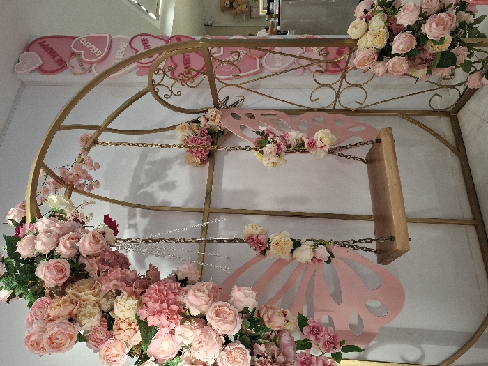 This image displays an indoor decorative setup within a commercial establishment in Blagoevgrad, Bulgaria. A prominent golden metal archway with decorative scrollwork on its right side frames a wooden swing suspended by two dark metal chains. The archway's upper-left section is heavily draped with artificial floral arrangements, primarily pink and cream roses and hydrangeas. Smaller floral clusters adorn the swing chains. Behind the swing, a large pink butterfly wing cutout is affixed to a white wall. To the right of the archway, a vertical stack of pink heart-shaped signs with white text, including "SWEET," "BE HAPPY," "GELATO," "BELIEVE," and "COFFEE," is mounted on the wall. A bouquet of similar artificial flowers rests on the light-colored floor at the base of the right archway section. The surrounding environment features white walls and a partial view of a counter area with a small teddy bear figurine on the far right. No individuals are present.