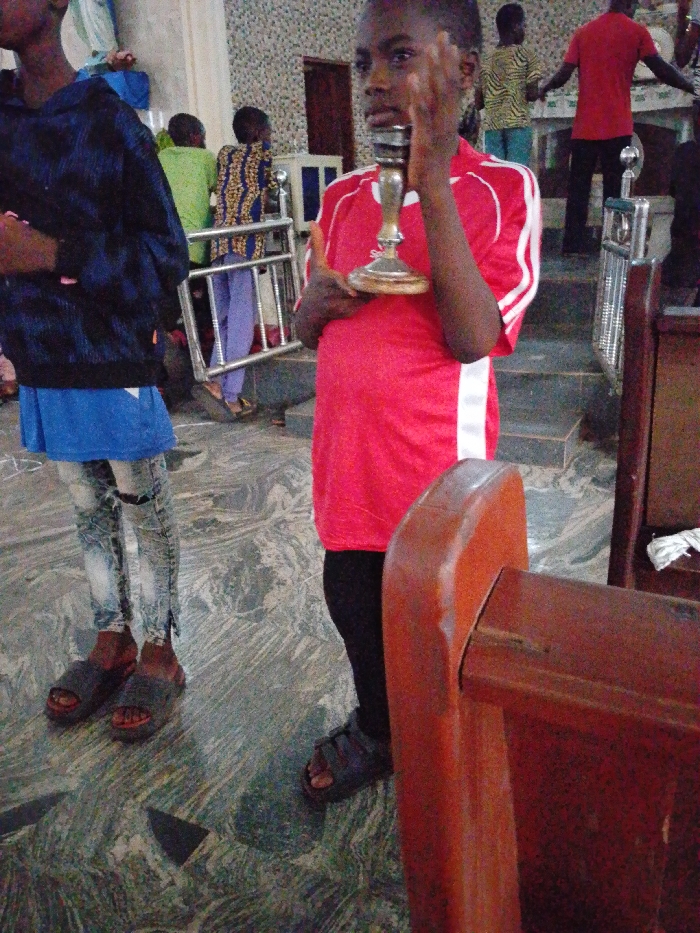 Inside a church with a marbled floor, a child in a red shirt and black leggings stands holding a silver chalice to his cheek